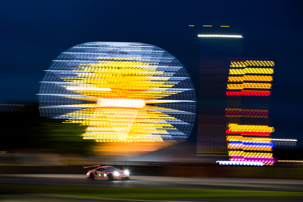 Czas na wyścig. Porsche 911 RSR z ponad 300 km/h na liczniku pędzi drogą D338 z Le Mans w kierunku Tours. W dwóch szykanach – na co dzień obstawionych fotoradarami, ale tym razem zamkniętych dla codziennego ruchu – około 515-konna sportowa maszyna klasy GTE bez litości zahacza o krawędzie toru. Później przelatuje przez zakręty Mulsanne i Indianapolis i mknie w kierunku słynnego Arnage – najwolniejszej sekcji liczącego 13,626 km długości toru Circuit des 24 Heures. Na wyjściu z Arnage kierowca dociska gaz i maksymalnie zdaje się wtedy na swoje doświadczenie… oraz odwagę. Po kilku sekundach dociera do Porsche Curves. Pięć ultraszybkich zmian kierunku jazdy, które kierowcy tak samo uwielbiają, jak i się ich boją, to najbardziej spektakularna część słynnego francuskiego maratonu.